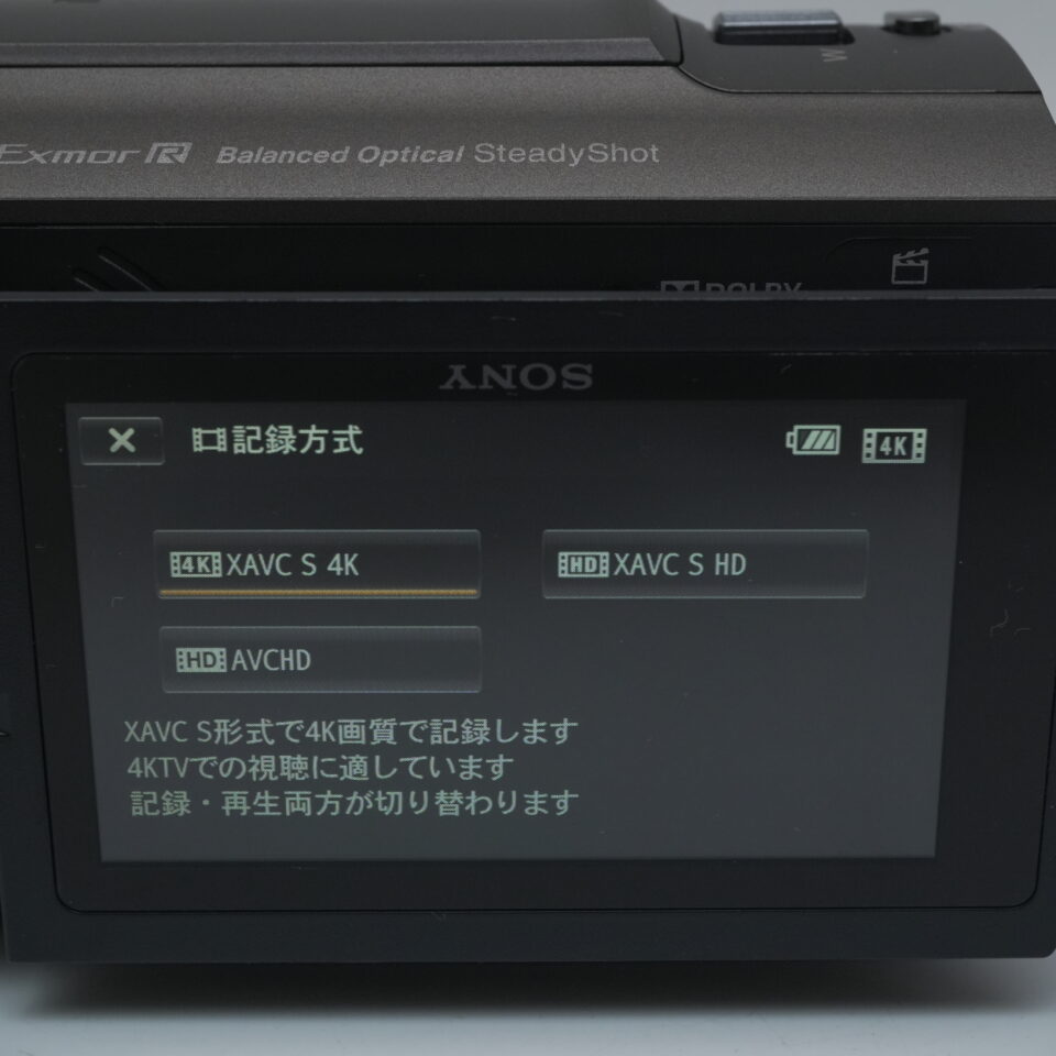 | 動画記録画素数/フレームレート | XAVC S 4K : 3840×2160/30p, 24p、XAVC S HD:1920x1080/60p, 30p, 24p、AVCHD画質:1920×1080/60p(PS), 24p(FX,FH), 60i(FX,FH), 1440×1080/60i(HQ,LP)、MP4 : 1280×720 30p |